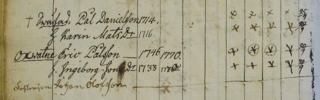 I Åsele husförhörslängd kan vi här se de som först bodde i Oxvattnet. Det var nybyggaren Pål Danielsson och hans hustru Karin Matsdotter. Sonen Erik övertog nybygget och Pål och Maria flyttade till Klippen. Lägg märke till den äldre stavningen, Oxwatne.