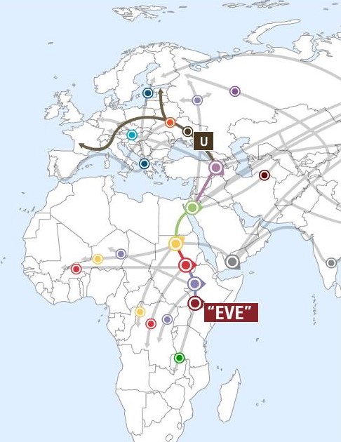 Min mödernelinje utvandrade från Afrika för ungefär 50 000 år sedan via nuvarande Saudiarabien, Turkiet, Östeuropa och vidare norrut mot Skandinavien.