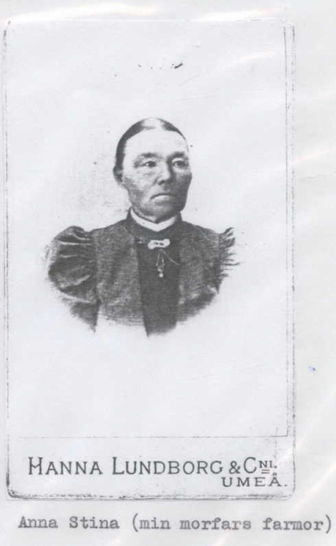 MMM Sara Christina Johansdotter. Född 1821-03-29 i Trehörningsjö, Fredrika Död 1903-04-08 i Myrheden, Fredrika |